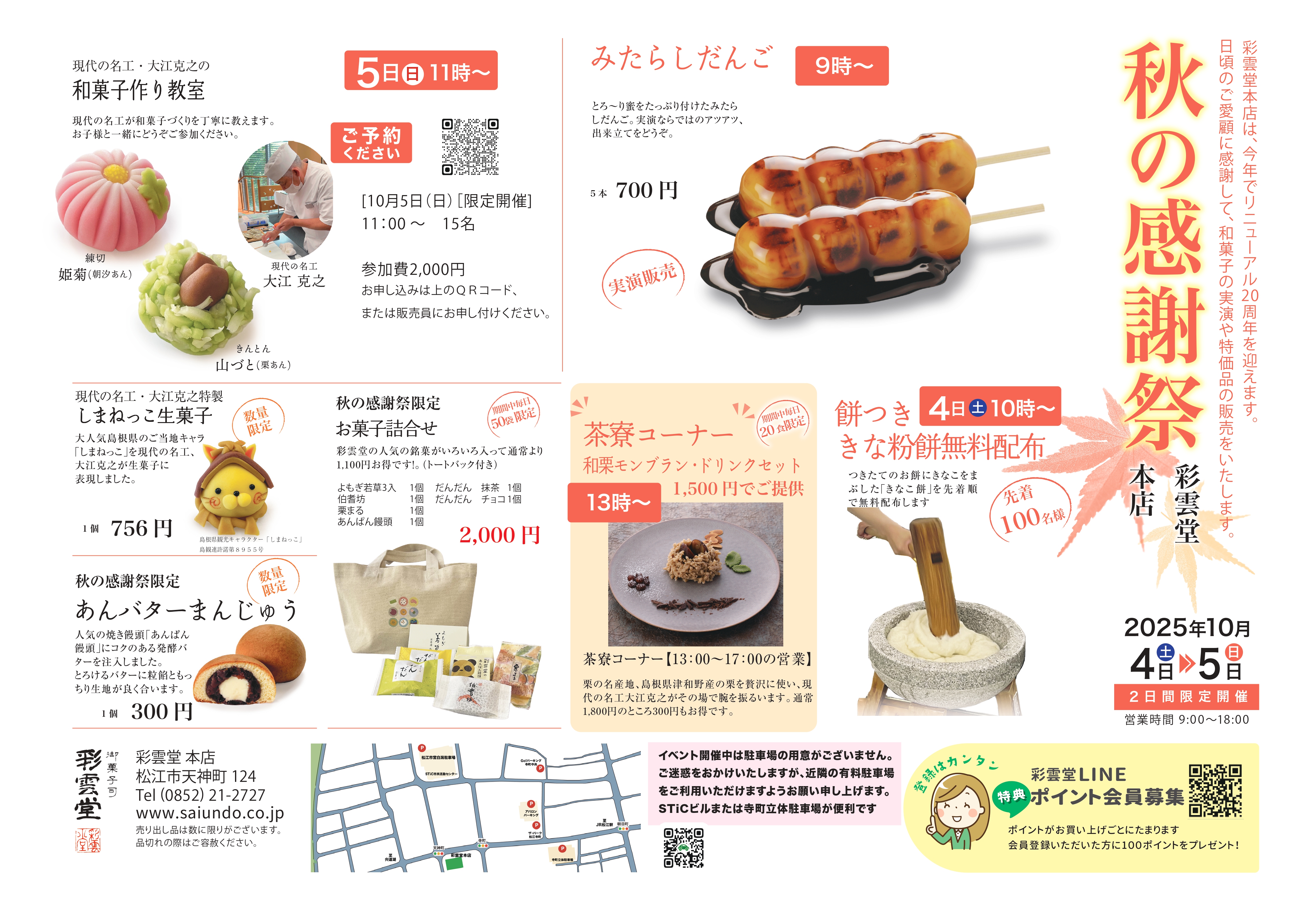 彩雲堂本店は今年でリニューアル20周年を迎えます。日頃のご愛顧に感謝し