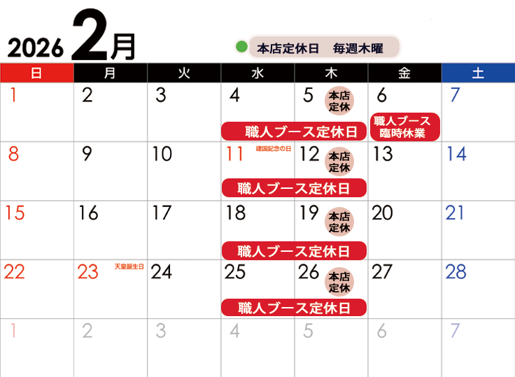 2/1(日)、2/5(木)、2/8(日)、2/12(木)、2/15(日)、2/19(木)、2/22(日)、2/26(木) |